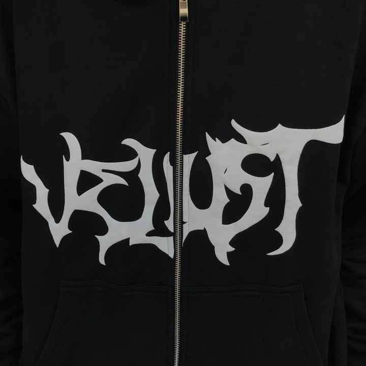 Plumindustry Bold Gothic Style Zip-Up Hoodie – Custom Streetwear Fleece Jacket for Men